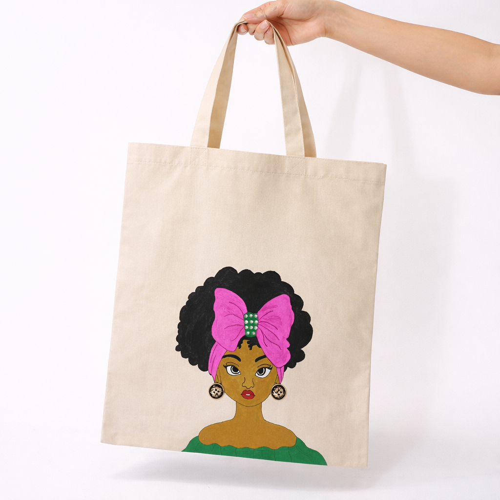 Quality: This premium 14×16 inch tote is crafted from eco-friendly, high-density natural canvas, providing a sturdy and sustainable base for the art. The design showcases a high-definition print of an original hand-drawn illustration, featuring a vibrant pink bow and mixed-media style earring accents that remain crisp and fade-resistant.