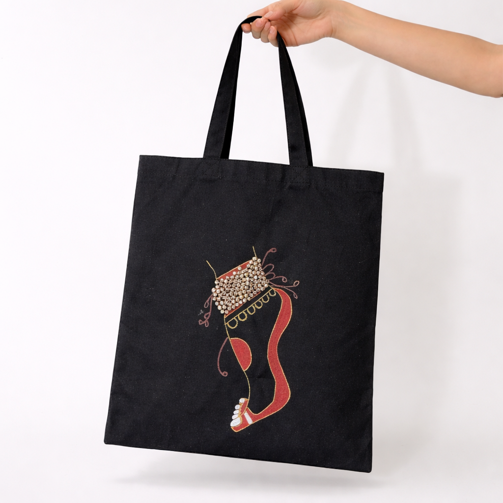 Quality: Crafted from premium, heavy-duty black cotton canvas that is built to last. The artwork is a high-definition print of an original hand-drawn sketch, ensuring that the intricate details of the bells and the flow of the traditional dancer’s movement are preserved with fade-resistant inks.