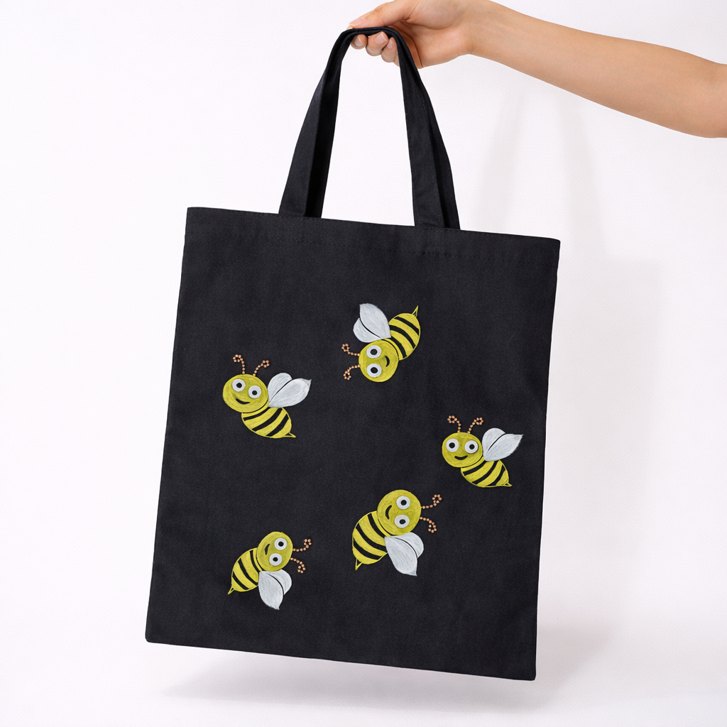 Quality: This 14×16 inch tote is crafted from premium, heavy-duty black cotton canvas, providing a durable and sophisticated backdrop for the art. It features multiple hand-painted honeybee illustrations, rendered with high-definition, fade-resistant pigments to ensure the vibrant yellow and white details remain bright.