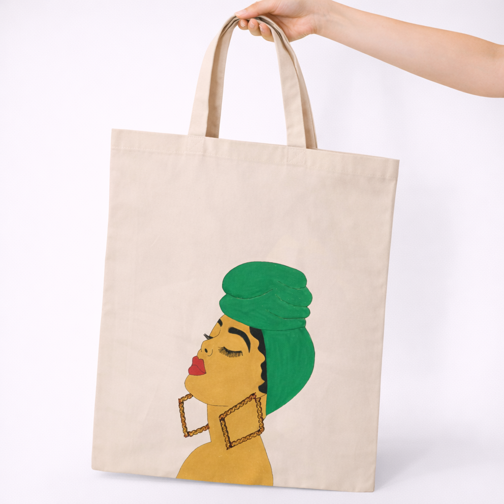 Quality: The Emerald Serenity Artistic Tote Bag is a breathtaking testament to the beauty of hand-drawn illustration and premium textile craftsmanship. Measuring a spacious 14×16 inches, this tote is expertly constructed from high-density, eco-friendly natural canvas, offering a sophisticated off-white finish that highlights the vibrant artistry of the central character. The fabric for The Emerald Serenity Artistic Tote Bag is specifically selected for its heavy-duty weight and smooth texture, ensuring the bag maintains a professional, structured silhouette even when fully loaded with your daily essentials. The artwork features a stunning profile of a woman with her eyes peacefully closed, wearing a rich, multi-layered emerald green headwrap that has been rendered with high-fidelity, fade-resistant pigments. To add a layer of luxurious tactile appeal, The Emerald Serenity Artistic Tote Bag incorporates a bold 3D element: oversized, square-shaped golden chain earrings that shimmer with a realistic metallic finish. Every seam of The Emerald Serenity Artistic Tote Bag is reinforced with precision stitching, and the handles are cross-stitched to provide industrial-strength load-bearing capacity, making this piece of wearable art as durable as it is enchanting.