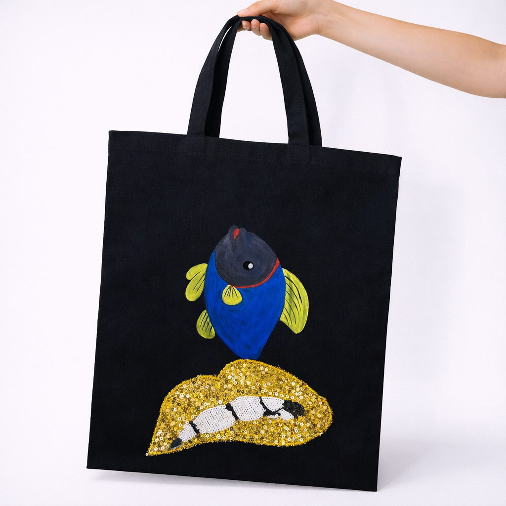 Quality: The Golden Sea Muse Artistic Tote Bag represents a stunning leap into experimental mixed-media fashion, artfully combining vibrant hand-painted elements with high-texture 3D appliqué. This premium 14×16 inch tote is expertly constructed from high-density, heavy-duty black cotton canvas, providing a rich, matte backdrop that allows the aquatic-inspired colors to truly pop. The choice of deep black canvas for The Golden Sea Muse Artistic Tote Bag ensures a sophisticated, modern aesthetic that remains resistant to the wear and tear of a daily commute. At the heart of the design is a bold, hand-painted sapphire blue fish with sun-yellow fins, seemingly leaping from an extraordinary base. The bottom of the illustration features a pair of oversized, high-relief lips meticulously crafted from thousands of shimmering gold and white sequins, creating a multi-dimensional, light-catching effect that demands attention. We utilize only high-fidelity, fade-resistant pigments to ensure that the deep blues and bright yellows of the fish remain as vivid as a tropical reef. Every The Golden Sea Muse Artistic Tote Bag is built for extreme longevity, featuring reinforced cross-stitched handles and precision-sewn internal seams that can comfortably support your tech accessories and daily groceries. This is not just a utility carrier; it is a piece of wearable avant-garde art that pushes the boundaries of traditional textile design.