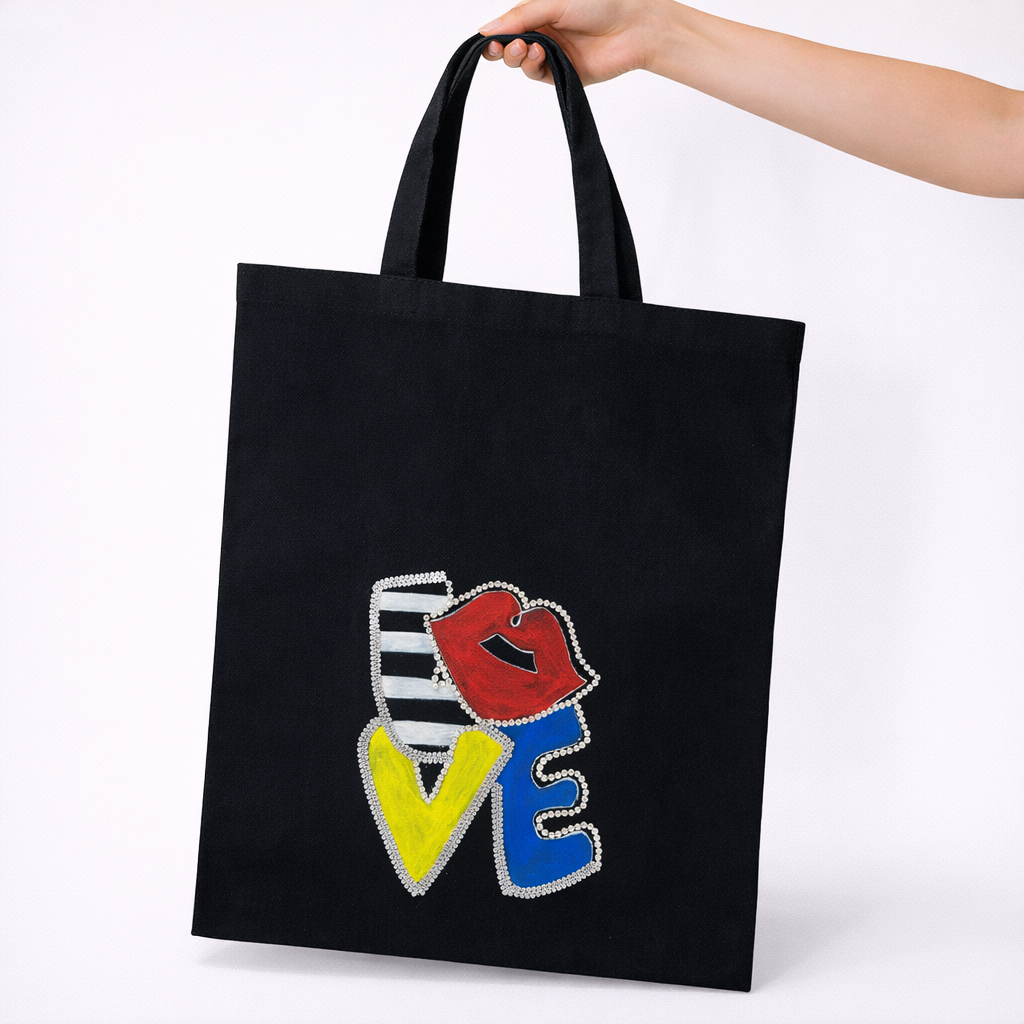 Quality: The Pop Art Love Artistic Tote Bag is a high-octane celebration of contemporary design and tactile luxury. This 14×16 inch tote is expertly constructed from premium, heavy-duty black cotton canvas, providing a deep, matte foundation that allows the vibrant pop art colors to radiate with maximum impact. The choice of midnight black canvas for The Pop Art Love Artistic Tote Bag ensures a sophisticated, urban aesthetic while offering superior resistance to daily wear and stains. At the core of the bag is a bold, graphic representation of the word “LOVE,” where each letter is treated as an individual piece of art. The “L” features classic monochrome stripes, the “O” is transformed into a pair of sultry red lips, the “V” shines in electric yellow, and the “E” stands out in a rich royal blue. To push the boundaries of traditional accessory design, The Pop Art Love Artistic Tote Bag is finished with an exquisite 3D border of shimmering silver rhinestones that outline every letter, creating a brilliant, light-reflecting effect. We utilize high-fidelity, fade-resistant pigments to ensure that the primary colors remain as sharp and daring as a comic book panel. Every The Pop Art Love Artistic Tote Bag is built for longevity, featuring reinforced cross-stitched handles and precision-sewn seams that can comfortably support your tech and daily essentials.