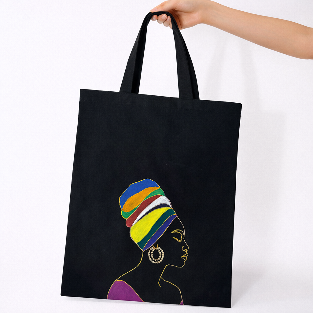 Quality: The Radiant Crown Artistic Tote Bag is a celebration of heritage and modern artistry, meticulously designed to provide a premium carrying experience. This 14×16 inch masterpiece is constructed from high-grade, heavy-duty black cotton canvas, chosen for its exceptional durability and deep, matte finish. This dark canvas serves as the perfect dramatic backdrop for the vibrant, hand-drawn illustration of a woman in profile, wearing a stunningly colorful, multi-layered headwrap. The artwork on The Radiant Crown Artistic Tote Bag is rendered with high-definition, fade-resistant pigments that capture the intricate gold line work and the bold primary colors of the headpiece with remarkable clarity. Every The Radiant Crown Artistic Tote Bag is finished with reinforced cross-stitching at the handle stress points, ensuring that the bag can safely support your daily essentials without compromise. The handles themselves are designed with a comfortable drop length, allowing for easy over-the-shoulder carry throughout long commutes or shopping trips. By integrating artistic flair with sustainable, long-lasting materials, The Radiant Crown Artistic Tote Bag stands as a testament to high-quality craftsmanship that respects both the environment and the wearer’s personal style.